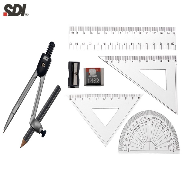 ทำจากอลูมิเนียมอยางดี วัดได้แม่นยำ ตัวเลขและมาตราส่วนได้มาตรฐานสากล ประกอบด้วย วงเวียนจับปากกาเขียนแบบ/ดินสอ + ครึ่งวงกลม + ฉาก +บรรทับ + ยางลบ + ไส้ดินสอ กบเหลา