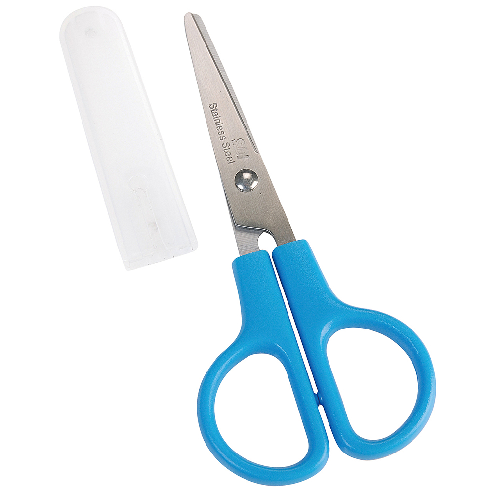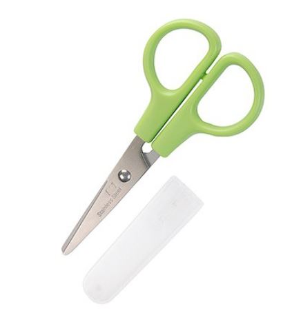 กรรไกรเด็กเล็ก ไม่มีอันตราย ปลายมน ใบมีดผลิตจากสเตนเลสคุณภาพดี คม ทนทาน แข็งแรง มีปลอกพลาสติกใสสวมให้ ด้ามจับถนัดมือ ด้ามจับทำจากพลาสติก ABS ตัดได้แม่นยำ ใช้ตัดผ้า กระดาษหนา และงานประดิษฐ์ต่างๆ ขนาดความยาว 5 \" บรรจุ 1 ชิ้น/แผง มี 3 สี