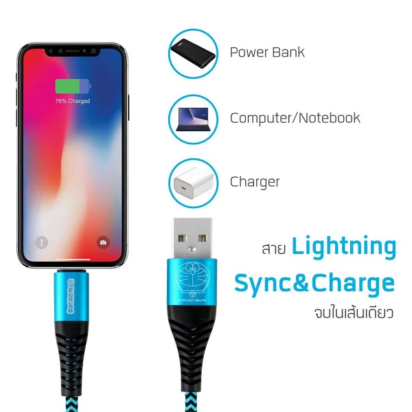 สาย Lightning USB ลิขสิทธิ์แท้ลายโดราเอมอน สายยาว 100 ซม. สามารถใช้งานได้ทั้งชาร์จและโอนย้ายข้อมูล สายชาร์จหุ้มด้วยฉนวน 3 ชั้น ช่วยการหักงอ แข็งแรง ทนทาน