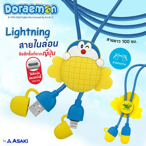 สายชาร์จ&โอนย้ายข้อมูลหัวแจ๊ค Lightning สายถักไนล่อนสีฟ้า ทนทาน มีโดราเอมอนกำลังจะกินทอฟฟี่สีเหลืองสดใส ใช้เป็นตัวรวบสาย สามารถให้สั้น/ยาวได้สะดวก รองรับการใช้งาน : iPhone/iPod/iPad